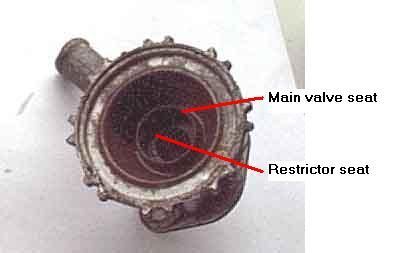 A cutaway of a typical Heater valve from Paul Hunt. Note the Yellow restrictor against its seat, and the Blue Main valve, part of the diaphram, which is off of its seat in this photo.