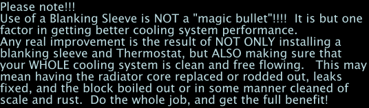 This a photo of the commonly available blanking sleeve once intended only for racing. It was not originally designed to be used with a T-stat, but it does work well with one to shut off that bypass port and help restore the original coolant flow when your engine is fully warmed up.