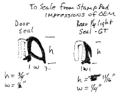 These are impressions made from OE weatherstripping from my 1968 MGBGT. On the left is the main door weatherstrip and on the right is the cross section of the rear quarterlight weatherseal. To make these impressions, a sample was cut across the seal, and then the seal pressed into an ink pad and then onto paper. I have highlighted the rubber areas to make them more visible. I do have actual samples available. As you can see, most all current replacement seals are a bit off from these, but close enough in terms of function.