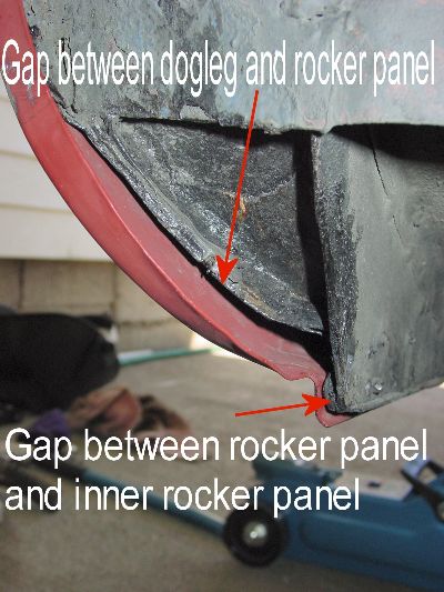 The gap between the dog leg (outer skin) and the inner rocker panel is where most all of the dog leg rot begins, not usually inside the rocker itself. Therefore it is most important to a) keep the crap OUT, and b) to shoot some sort of corrosion preventative (Waxoyl, Penetrol, etc) between these panels. The accumulated dust and debris acts like a sponge and when water gets in, the dirt just holds it there so that it can attack the spot longer. Also note that you should seal ALL the edges of the replacement panel as water and silt can enter along any edge, run down to this gap, and start corrosion.