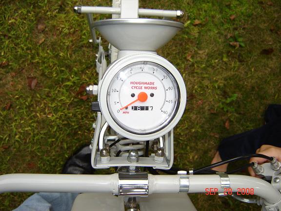 The tank you see, I fabricated from fiberglass, actually a frm built from 1/4" foam board covered woth fleece and fiberglass resin. If I did it again, I would use fiberglass cloth. Under the cover (and bonded to it) is a 1/2 gallon steel tank that can be bought from bicycle-engine vendors. The seat and headlight are from eBay. The seat is a vintage long-spring frame that I padded with modern foam and covered with goat skin. The headlight was a small railroad lantern. It throws light like a flashlight, but I will not ride at night. Also mounted in the headlight is the speedometer with a custom face.
