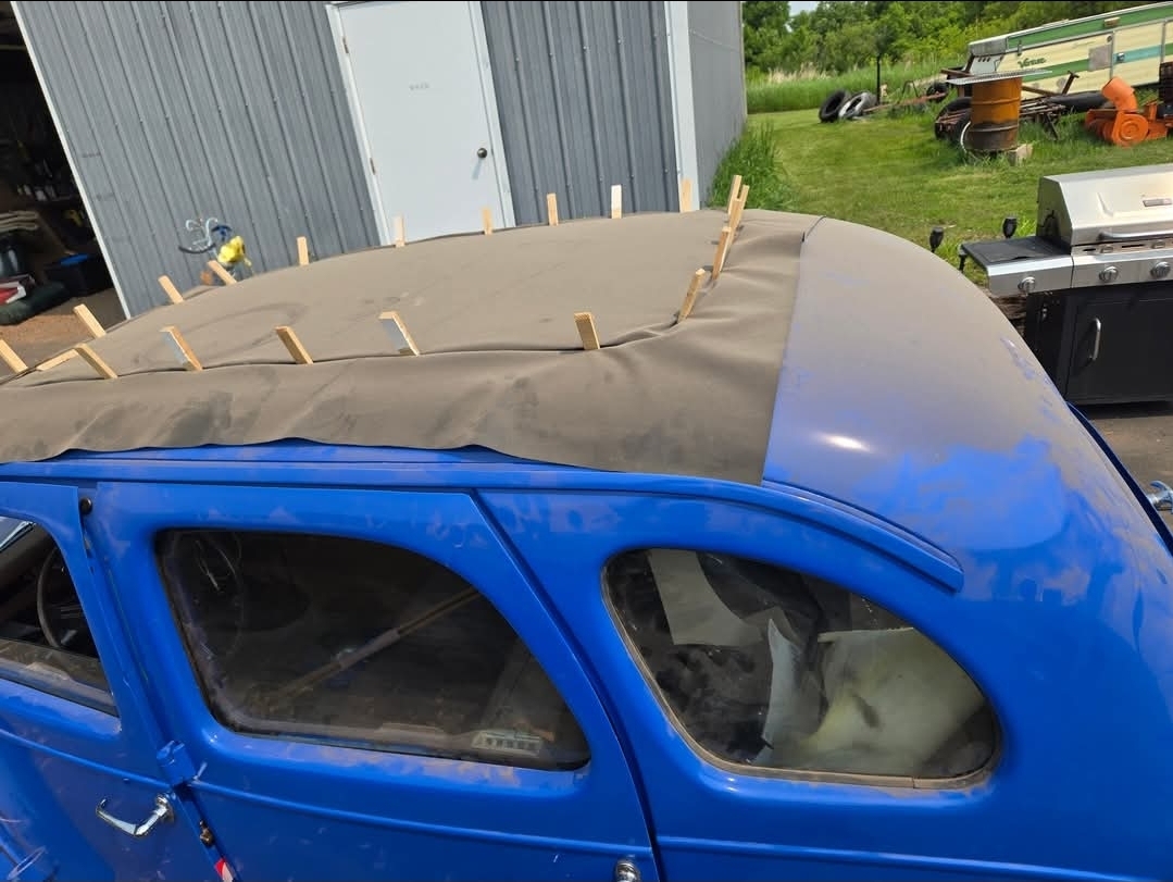 No rush, from your description I have it right, I will ave my son email you as he is the one who put our roof on and I think it was a 2 day job in the hot sun. Say hi to wifey for me and my prayers are to herI suspect it is like the '48. There should be 4 "U" shaped straps that bolt down through those 8 holes in the wood floor. There should be caged nuts under the floor, 1/4-20 if I remember right. I can post a photo of a strap but I don't have a weekend care giver for my wife so can't get it before Monday. On another thought, I am trying to install the rubber retainer strip for the fabric top insert. This is proving to be almost impossible. How in the world did you do it?