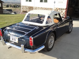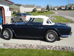 The 65 TR-4, restored in 1985. Current mileage 9942, no rust, new top, wire wheels, very clean, solid car, excellent interior, finished trunk. 2 small chips by rear pass-side wheel well. I added the TR-250 strip, but it is a TR4.