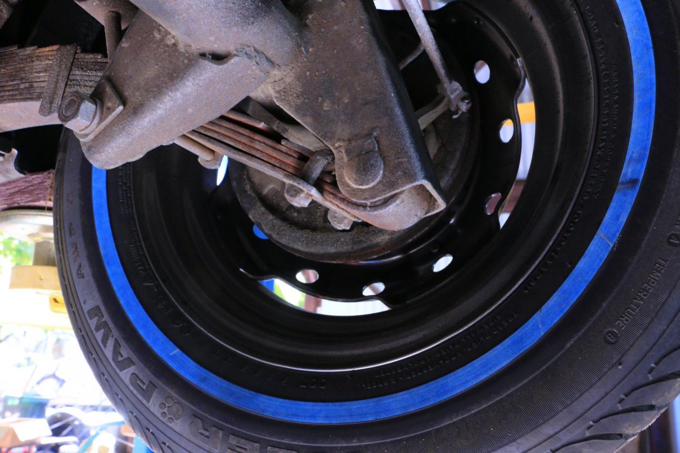 it looks like you have an issue with the axle housing shifting. You need to put it on a lift, loosen the mounting bolts that hold the axles to the springs and center that sucker! Once you get the rear end centered you need to check the bushings, shocks, springs, etc. to make sure you don't have other issues.