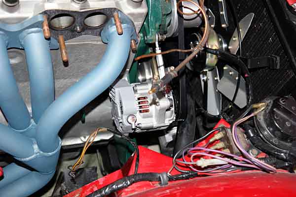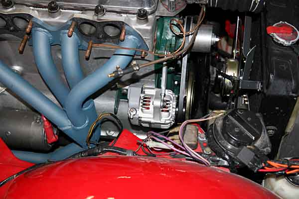 I took some pictures of the Nippondenso alternator in place. The only mod I had to do was to shorted the mouting pedestal by about 1/2", then I drilled out and retapped the hole for a 3/8" bolt.
