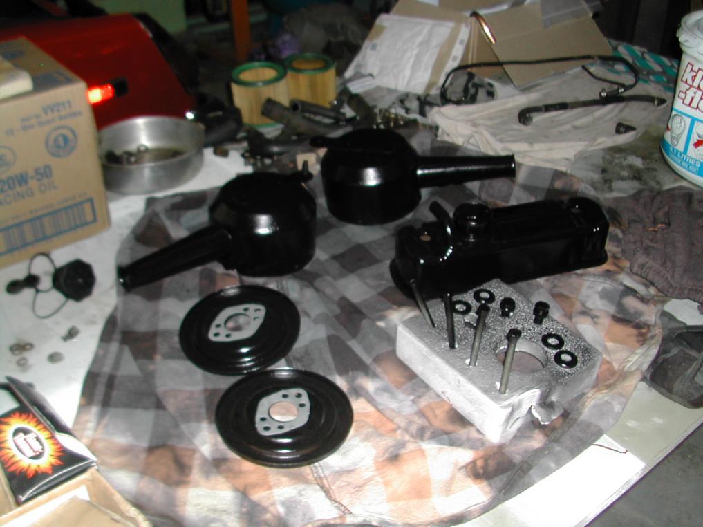 While the carb bodys soak in kleen-flo & the throttle shafts are being delivered I got everything else ready to go, one more weekend of work & I hope to fire er' up ! Everyone loves pictures so here is how the engine bay looks now (not a show car, just a maintained driver) & the rest of the sandblasted & painted bits awaiting installation.