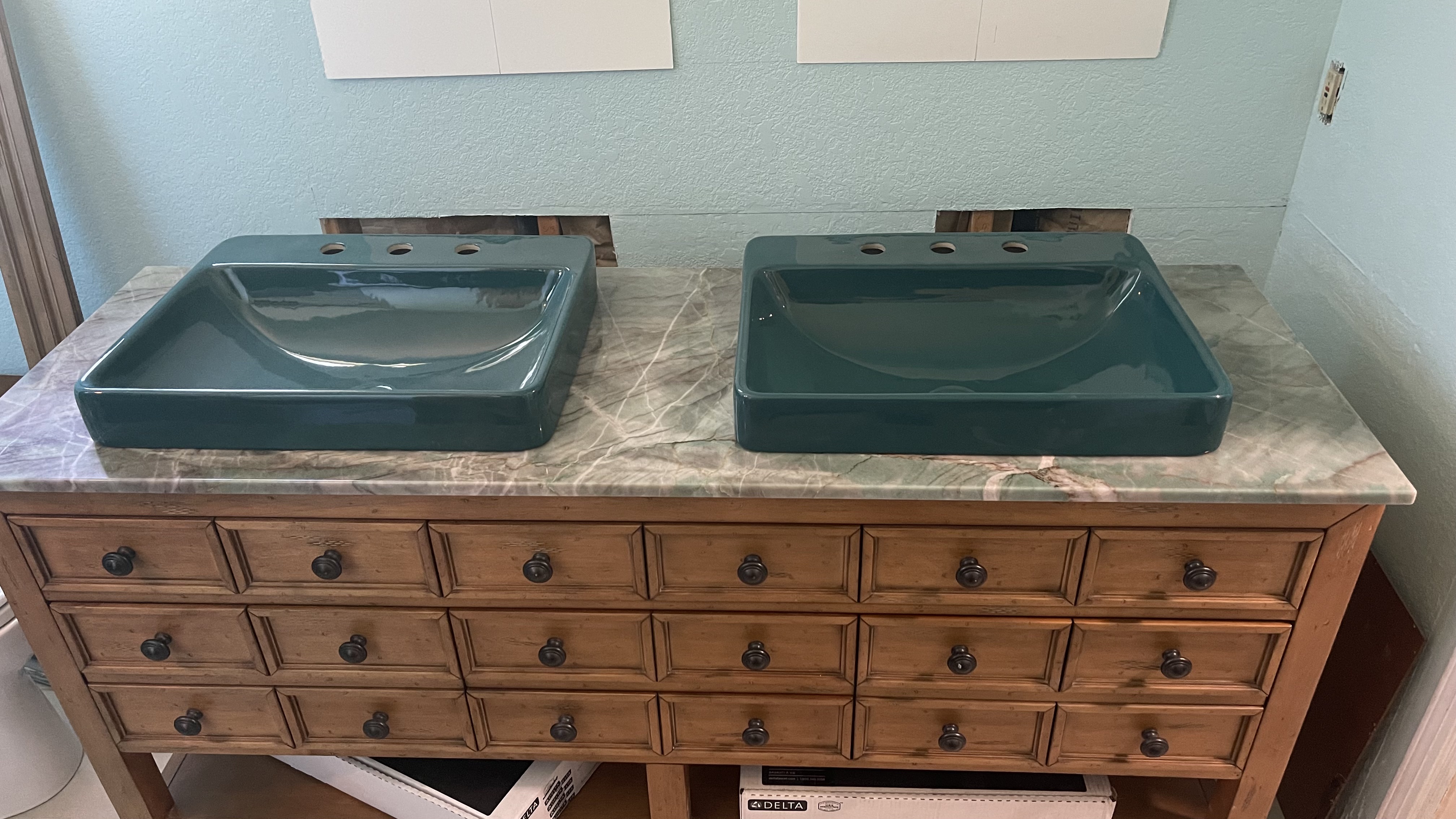 OMG, Basil! British Racing Green sinks!Tuesday, June 3rd. Another major piece of the project done! Today they installed the stone counter top on the vanity and cut out the holes for my sinks. I still have to re-do the plumbing for these vanities and hook it all up, then have some electrical stuff to do, but there's light at the end of the tunnel.
