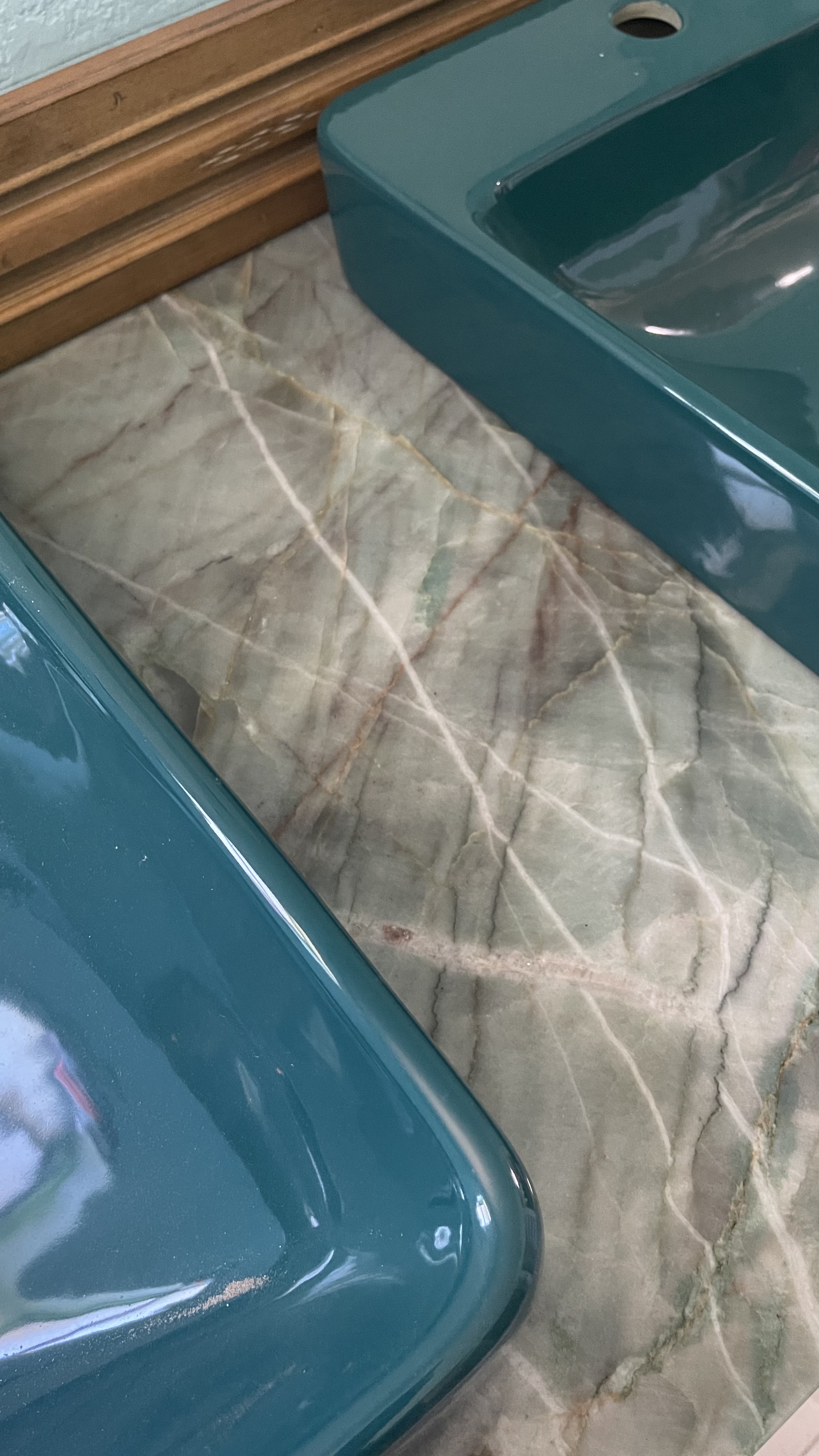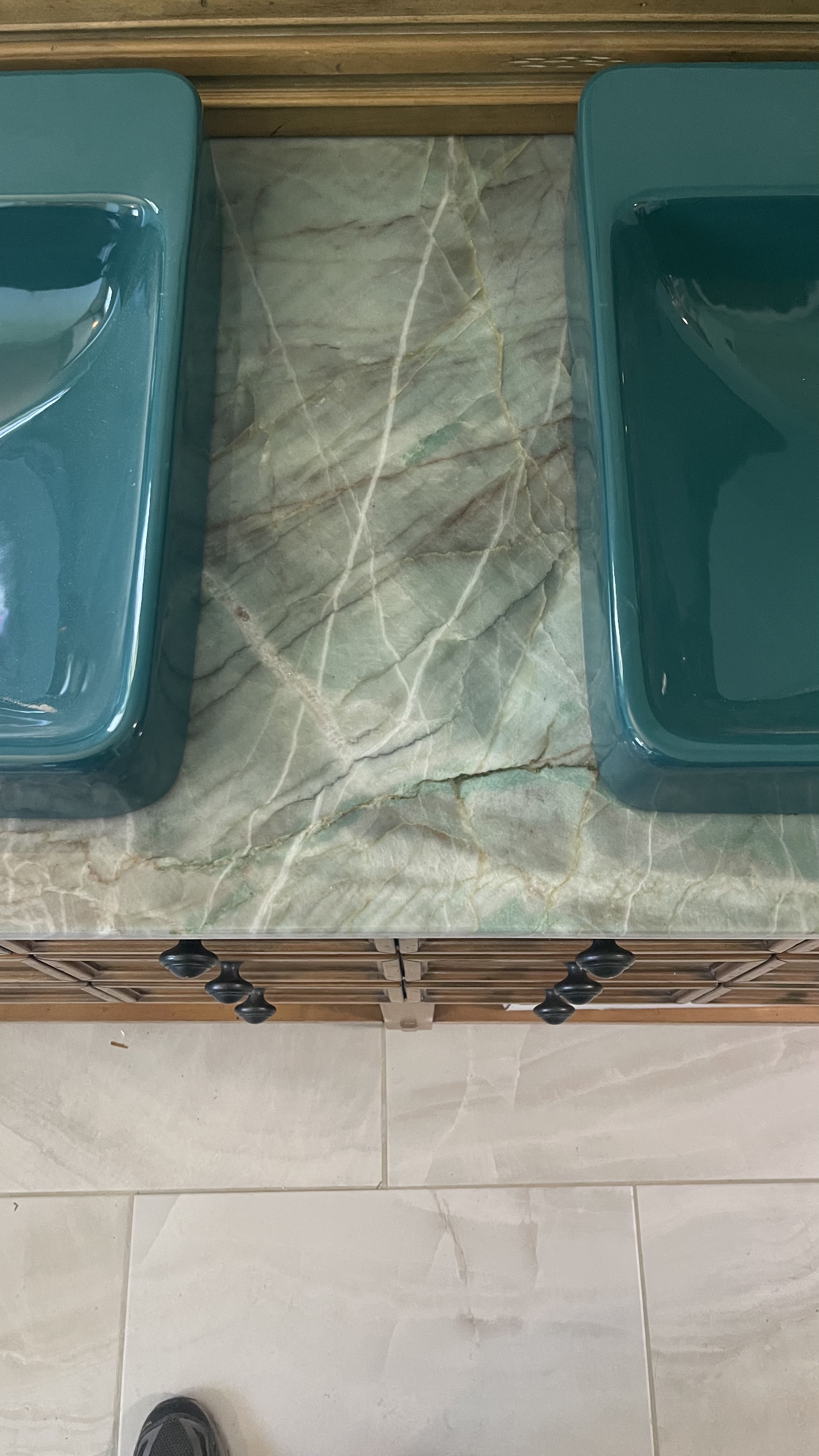 About the countertop stone, I had originally picked out a rather plain slab that I thought would not overwhelm the rest of the bathroom, especially the shower, which I want to be the main attraction. However, they called me recently to inform me that they had misplaced the original slab so that I had to go back down to their yard and pick a different piece. This time I decided to throw caution to the wind and picked a slab that has a lot more color, including greens that really go well (I think) with my teal sinks. In the end, I am very happy they misplaced the original slab because I'm very happy with how this came out, and more importantly, SWMBO is happy!