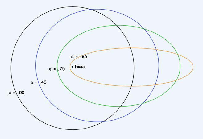 Most people think of an ellipse as a squashed circle. But mathematically, a circle is an ellipse whose wide part has been squished until it’s exactly the same as its narrow part. The eccentricity of an ellipse is how squashed it is. Zero eccentricity would be a circle.