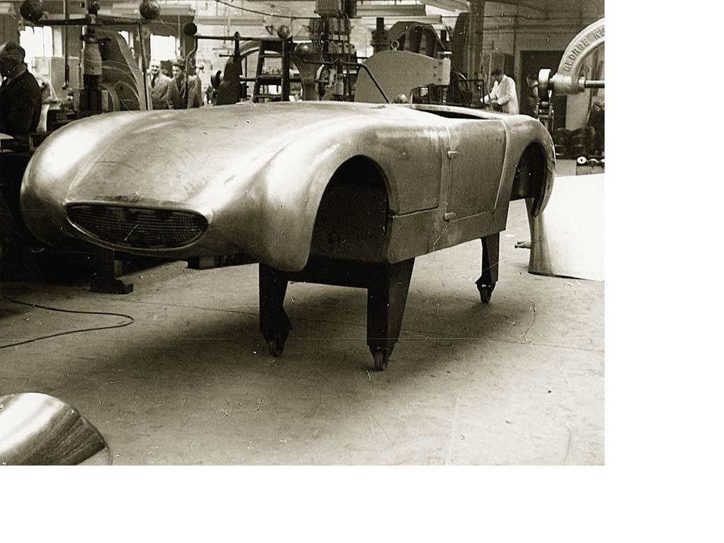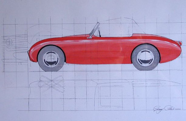 The Coker design was more rounded and more like the big Healeys. From the beltline up, it is almost just like the production version, but both ends are more squared off. Note how the rear is a little like an MGA with adaptors (piths?) for the standard lucas lights of the day. Also the bottom is flat on the production, an obvious ease of manufacturing. Te Coker sketch shows the rear hinged bonnet and the bugeye type lights...which he had folding down like a Porsche 928.