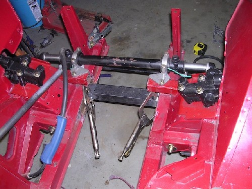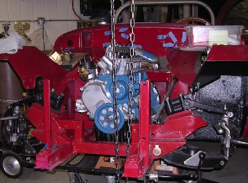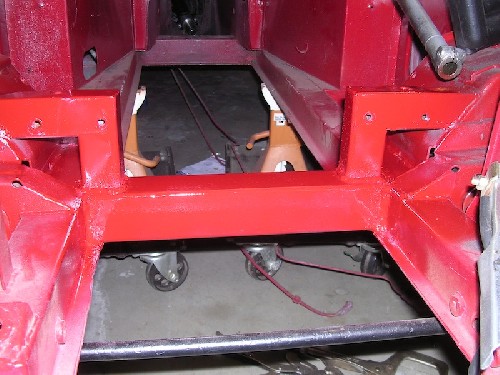 The first pics show new x-members Mike fabricated (the original one was rusted out on the bottom). The 3rd one shows the engine's first test fit (onto saddle-style mounts Mike fabricated, which took place right after the first of the year. The 4th one shows some 14" EMPI wheels on the front; the EMPIs might stay on the car depending on what Mike can get done, fabrication-wise. (He's going to look into getting a Datun 210 rear end cut down to fit.) The last one is of the Bugeye on the trailer for the first leg of its trip to a new home.