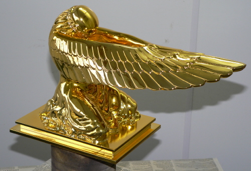 It's done by a process known as vacuum metalizing. Vacuum metallizing is a process where a metallic coating material is placed in a vacuum chamber with the workpiece to be coated. The material that is being applied is then heated until it starts to evaporate; this vaporized metal condenses on the product or workpiece as a thin metallic film. As this is happening, the part is being rotated for uniformity of the coat. Thin layers of paint can then be applied to produce other colors. Once complete, a clear sealer is usually added to prevent flaking.(a/p Wikipedia) This process, according to the website, is more like the silvering of a mirror and is done by spraying the metal onto the object. The photos look very impressive.