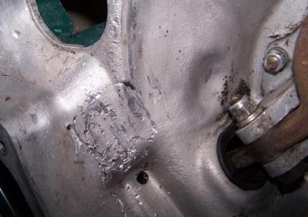 While cleaning up my garage today, I decided to clean up my old transmission, since every time one walked by it, the grease monster would grab hold of your pants. Once I got all the gunk from inside the bellhousing, I noticed these deep gouges. It looks to me like at some point a clutch decided to commit suicide, or there was something rattling around in there.