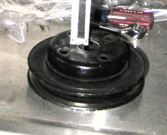 Whilst installing the Nippondenso alternator conversion, I noticed the crank pulley and water pump pulley didn't seem right. Sho' nuff, they're off about 1/4". The water pump pulley sticks out too far.