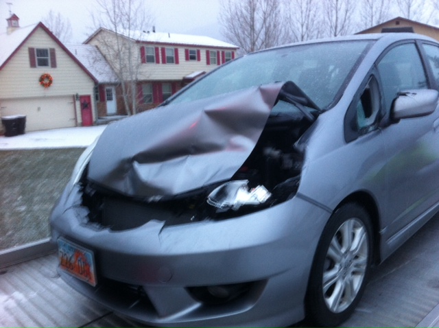 Well, it was bound to happen, and this morning it finally did. Hit a deer on the way into work while driving my Honda Fit. Wife and I are just fine, but the car has seen better days.