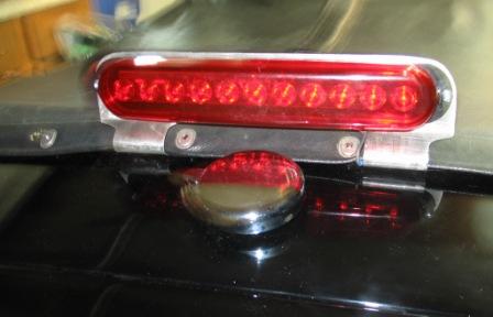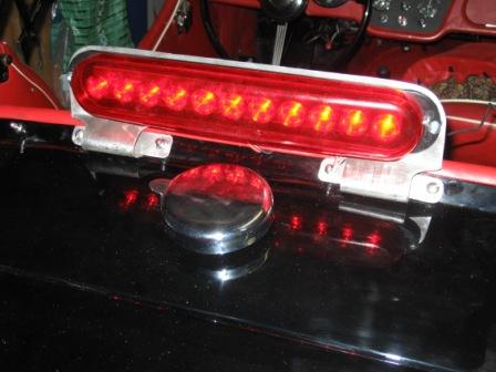This past winter, I designed and developed a prototype rear high light made with multiple red LEDs for the rear of my 1958 TR3A. It can be removed in a few minutes for a TRA judged concours and no-one could ever tell. It is secured under the rear flap of the tonneau cover or the soft-top. It is up and out of the way so that it will not interfere when I want to fill the fuel tank. There are no visible holes drilled or tapped in the rear saddle.