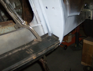 The triangular brace (for the shut panel) that you see in the second photo was replaced. The small rocker extension just behind this brace was also changed on one side. The rest of the sill and rocker sheetmetal is original. My panel beater (very experienced) was of the opinion that drivetrain in or out did not matter .. just important to keep all 4 wheels on the ground during any work. BUT .. I didn't have any major surgery being done to my car and it's is an almost rust free California car.