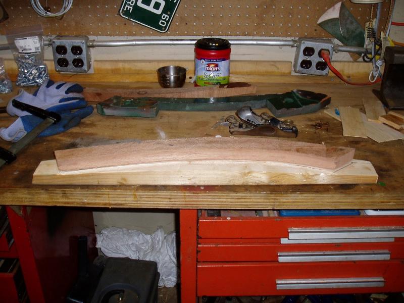 My first attempt to saw, plane and sand them to shape was a mediocre success at best. After looking closely at the old one I find no evidence of cutting or scraping the wood to shape so I am now guessing that the originals were steamed into shale. I have now made a wood mold that mirrors the shape of the inside of the piece. If I steam it and clamp it to the mold, the outside should closely follow the shape of the inside and the piece will be of uniform thickness, just like the original. The one thing I have not done is to allow for spring back. I will make a guess with some shims.