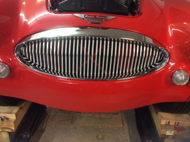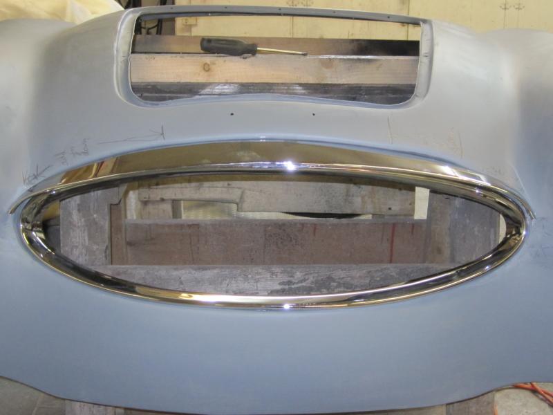 The previous owner of this project hired someone to weld on a new lower front section to the shroud. The shroud needed more welding and straightening, which I did, and it now is in primer. The new one-piece grille surround from Moss also arrived.
