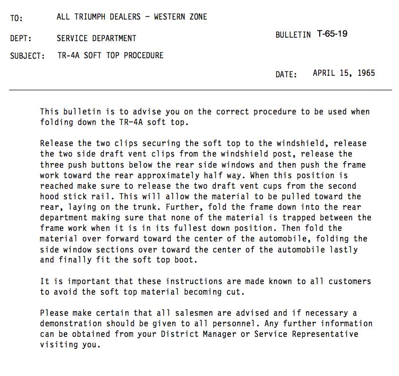 I found a copy of the TSB that talks about the proper way to fold the soft top on a TR4A, but I had some questions: