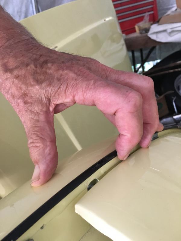 The wings are on (less one bolt with is persistently out of place), but the apron sits at least a quarter of an inch lower than the wings. I can see no reason for this unless the inner wheel well is a bit out of shape and the crosspiece sits too low. The only solution I can see is to bolt the apron to the fenders so they are flush and then ream out the holes for the bolts that attach the crosspiece to the inner wheel well and bolt them up tight--very tight! The bonnet should be flush too if the apron is correct.