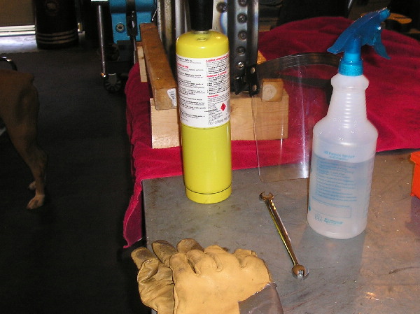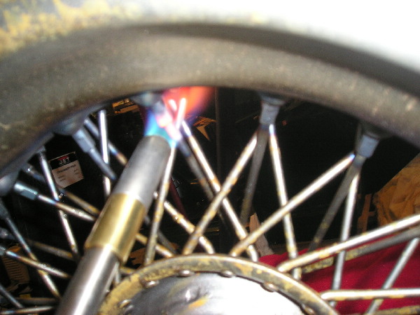 I'm taking my wires (4) over to North Carolina in about a week for Hendrix Wire Wheel to work their magic on them. One thing I learned after talking to them, is the the wire wheels have to be "tuned" which I knew, however, thay have to be tuned AFTER the tires are mounted, which I didn't know. To do that, ALL of the spoke nipples have to be able to turn. Most of mine, in all 4 wheels are frozen solid. I spent several weeks dowsing them with Kroil and then set to loosen them. on the first wheel(chosen at random) the net result was two loosened and two broken. I do have a small supply of spokes and nipples, but NOT that many. In my research I found that to get them broken loose I needed to heat them to a "cherry red" and then quench them with water. In fact several of you confirmed that method. This morning I decided to see what I could do. I have a MAPP gas torch a spoke wrench, my trusty bang upon table, a $1.25 squirt bottle and I went after it. Pictures attached. Net result, IT WORKED! Now, mind you, I needed some self training but after I broke one spoke, I learned not to force the issue. You have to get the nipple and about 1/2" of spoke cherry red, quench with water let cool a bit and they generally came loose. I had a few that I had to run through the process a second time, but once I got into the system I found it to be a reliable method to break them loose. and Yes, I did have a Fire extinguisher of the proper type handy. Been down that road in the past, don't want to go there again.