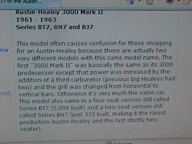 Further proof that you can't believe everything you read.anthony7777 said:randy,on the a.h.c.o.a. they give a discription of the 1961-1963,series bt7-bn7-bj7, i read it to say bn7 355 built rarest production healey,bt7 4 seat version 5096 built bj7's all had four seats.in 1962 the three carbs were added,the way i understood the wording is that bt7 was available in 2 or 4 seats and the bn7 only2,? check it out the way its written is confusing.ill have to read it again.