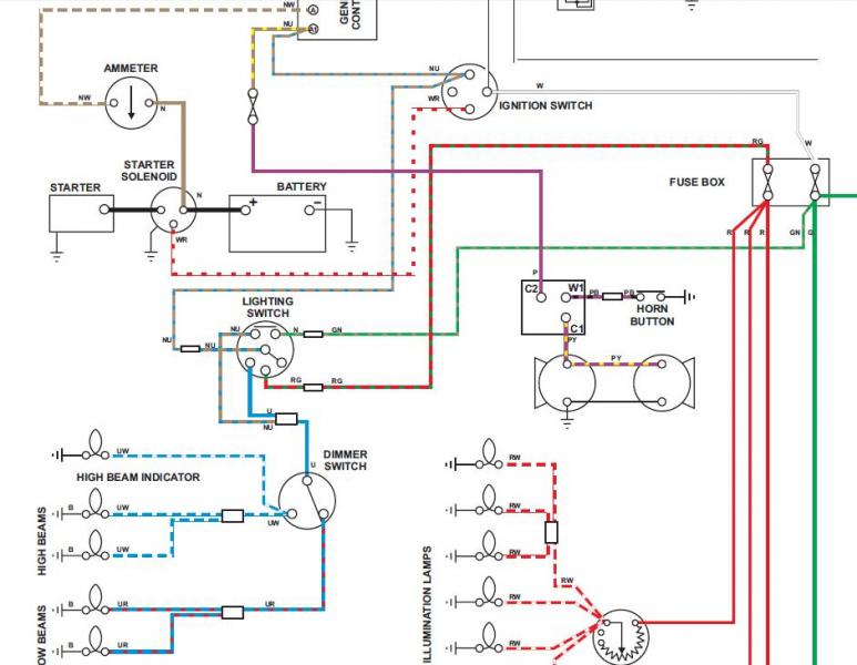 I assume that NG goes to the fuse box feeding from the Ignition switch. RG feeds the other fuse which goes to the marker lights and instrument gauges lamp rheostat. The U goes to the dimmer switch which feeds the headlights.