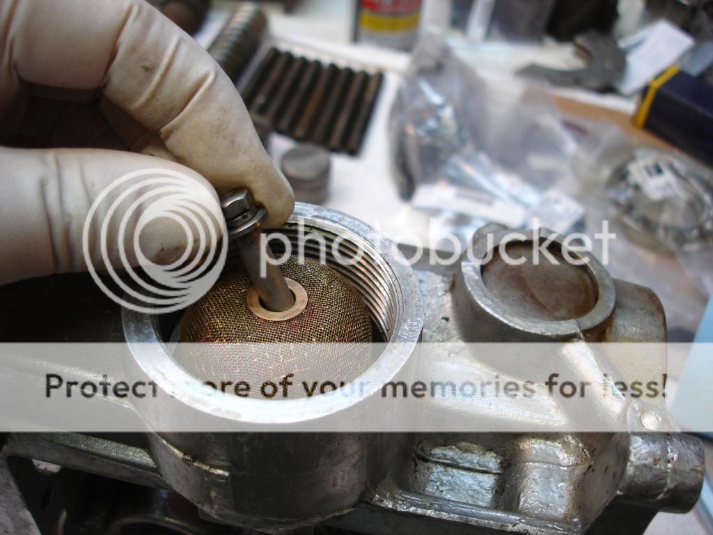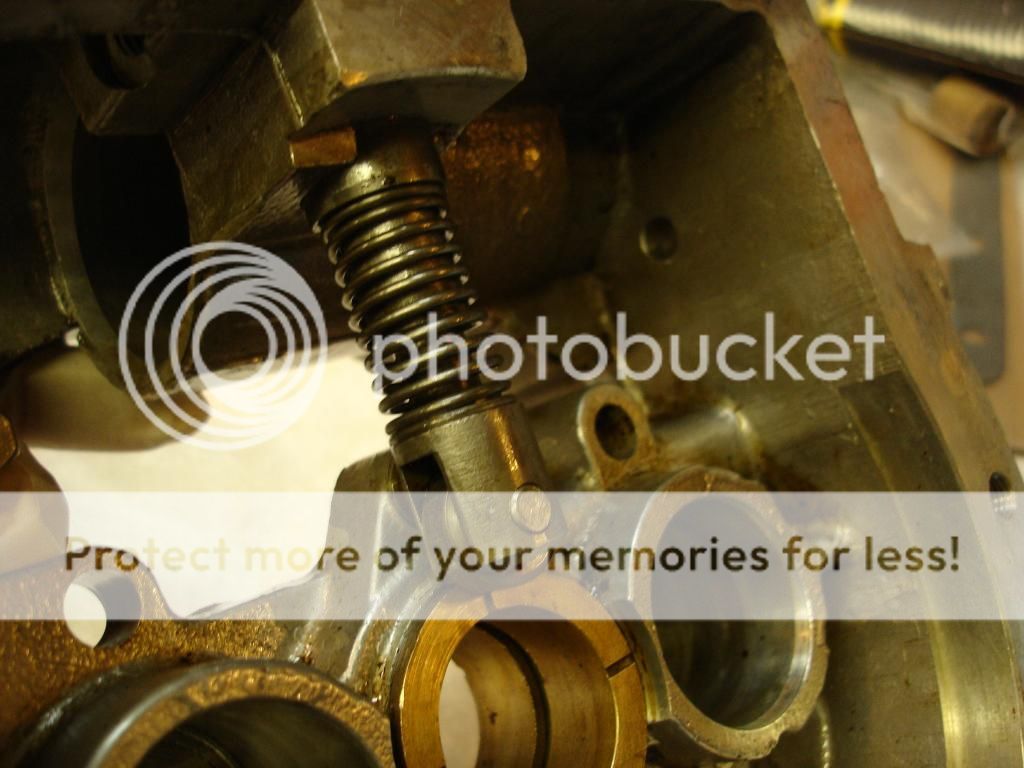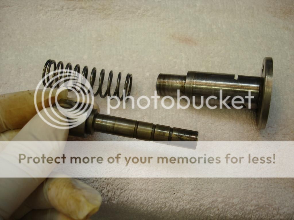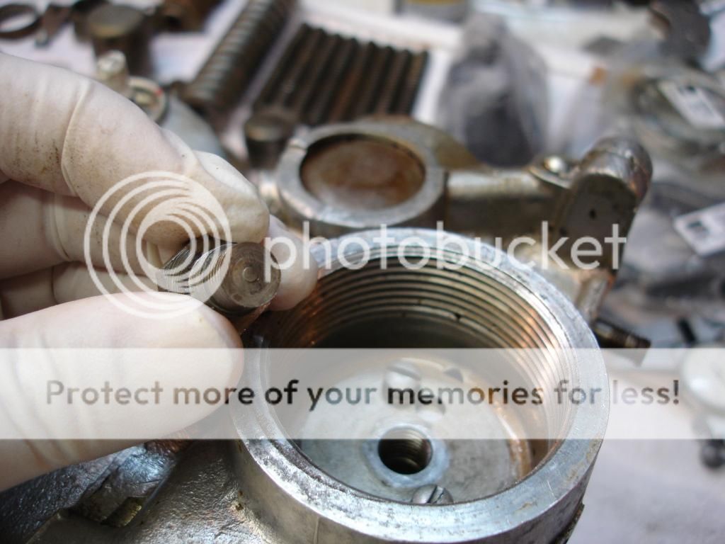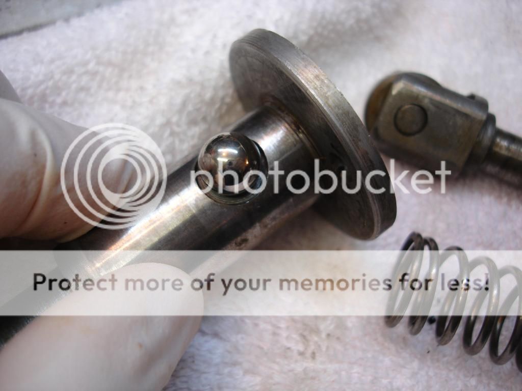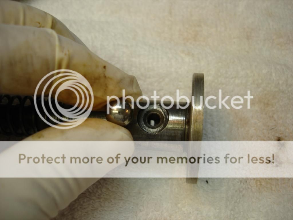Now the actuator valve. The valve goes in the hole, followed by this same ball/spring assembly used for the pump valve.