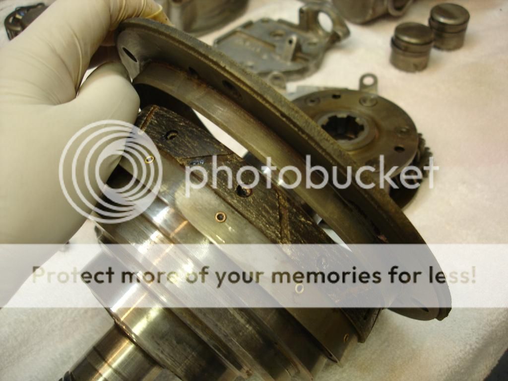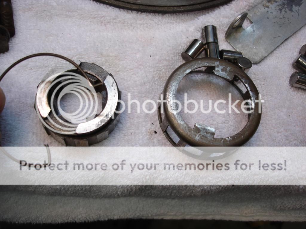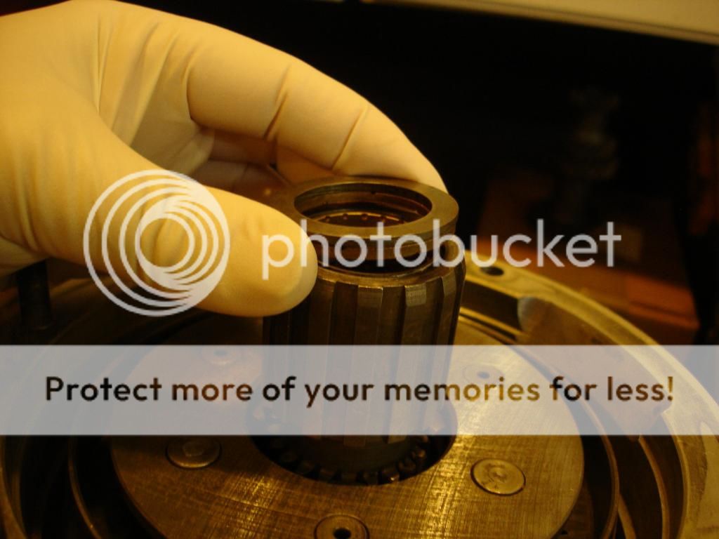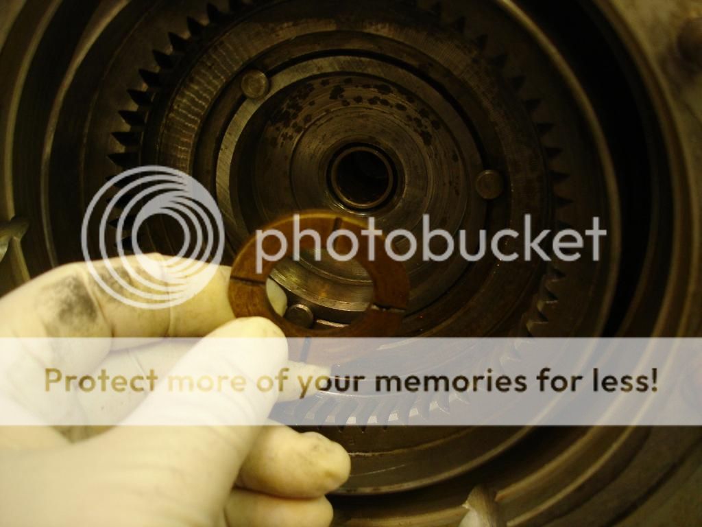 Now we have to check the end play of the sun gear inside the assembly. Remember the clutch drum slides back and forth on the sun gear splines, so the play has to be checked. These are the thrust washer and shim used to set the gear clearance. Once again, the shim is easily available...at $20 a pop!