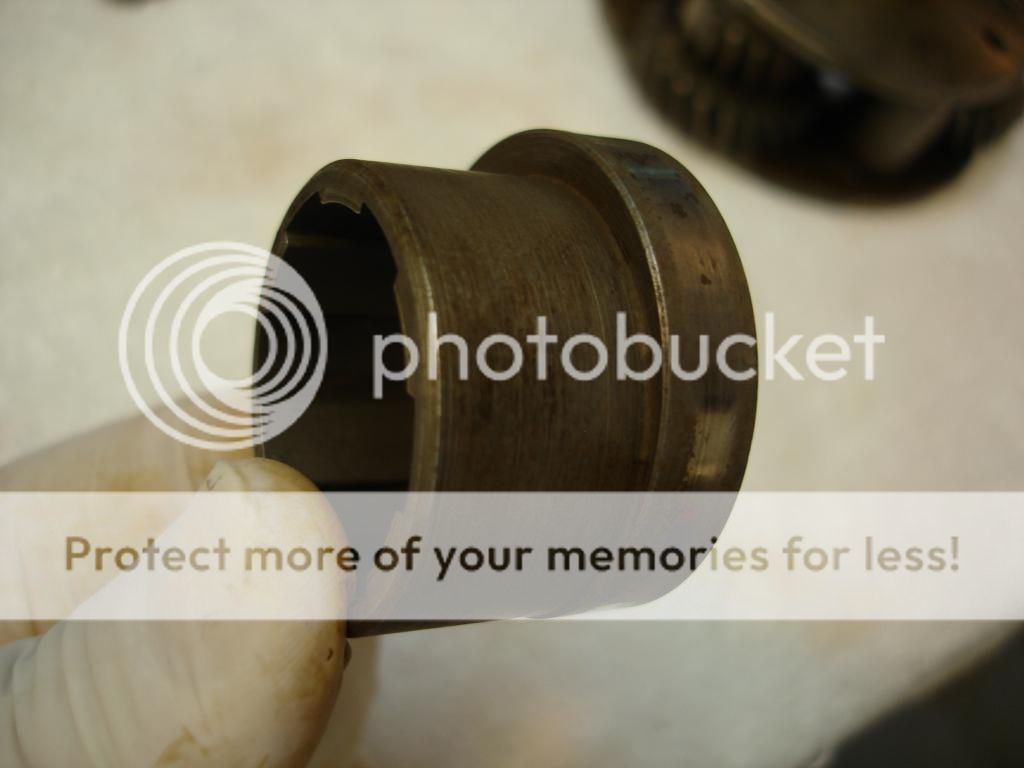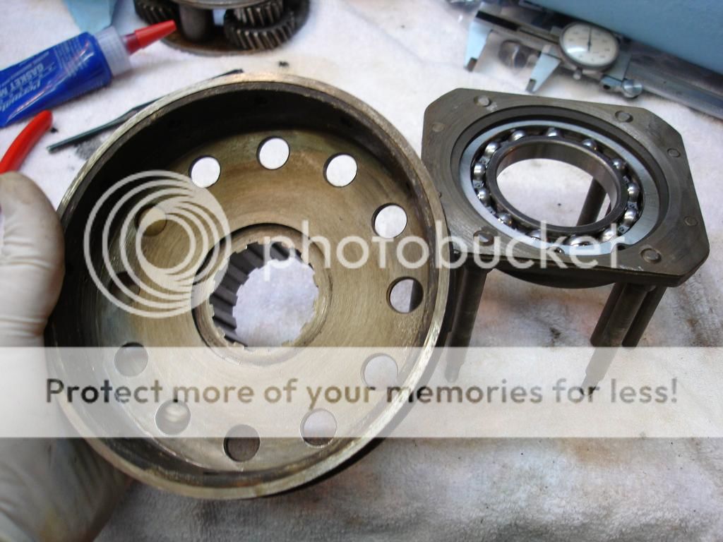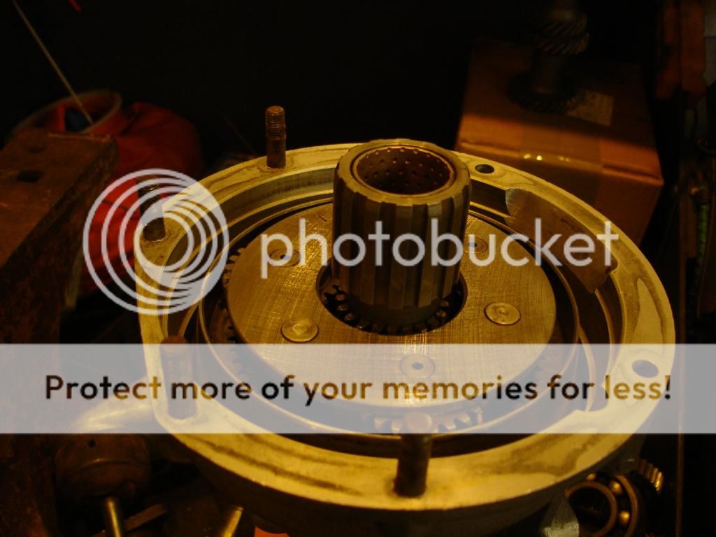 Now, in the manual the tail shaft is referred to as the "annulus". They are attached and are the same part. The anulus gets its name from the fact it has the large outer ring gear in it for the sun and planet gears. The outside of the anulus also has a cone shaped surface for the clutch drum to engage...but more on that later. I'm not going to go into how the gears work...just how they go together.