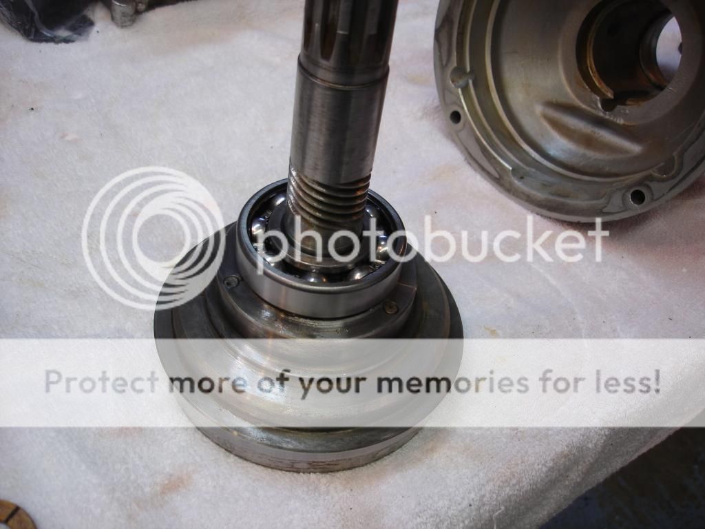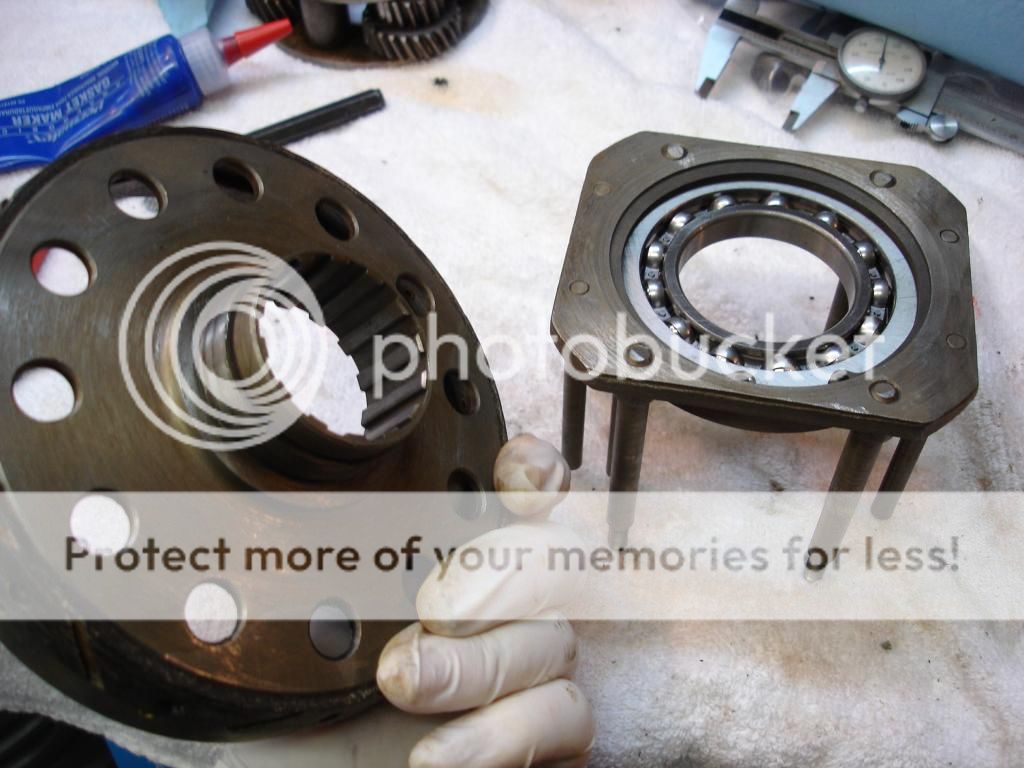 Now, the outer race of that bearing is driven into the front of the tailhousing. This is also a press fit, so a press is necessary. Hammering will destroy the bearing balls and races. Something to point out, I am using brand new bearings for the entire tranny. Not the bushes, but the ball bearings. No matter how much I tried to get the originalls turning freely, whenever I let them sit the black goo would bind them. I did not want to risk bearing failure.