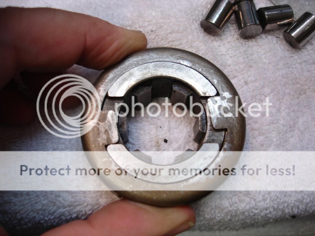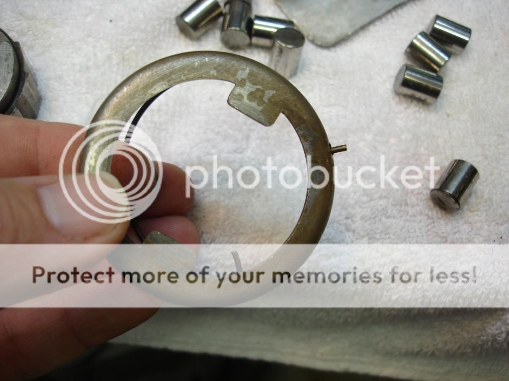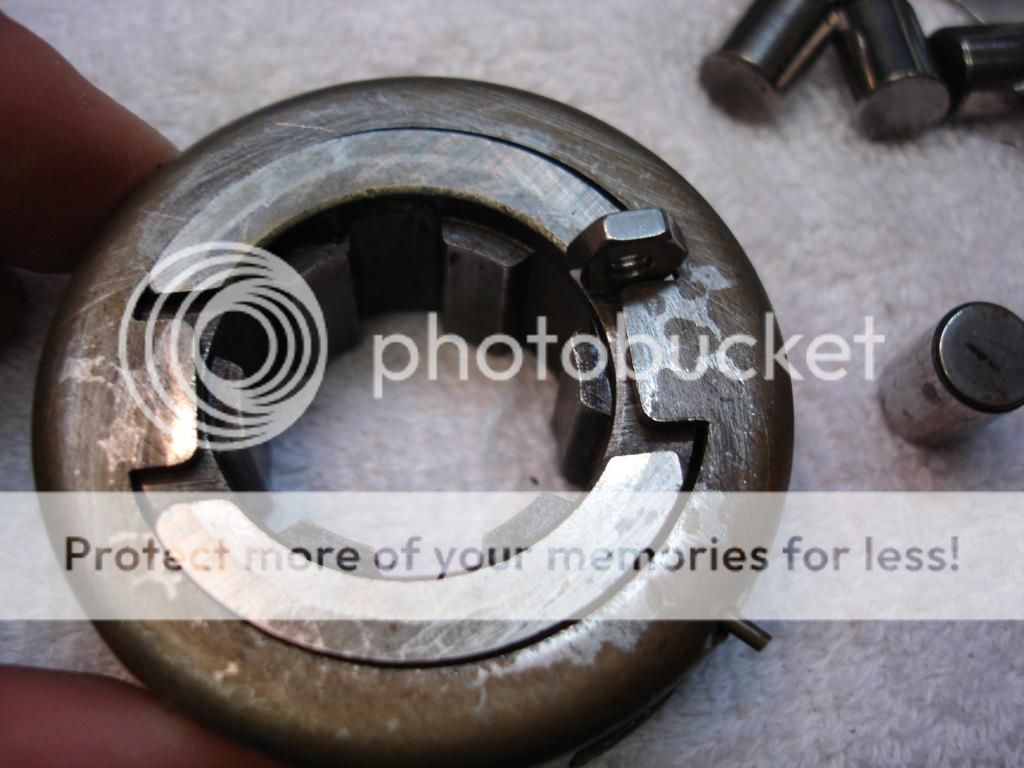 Now the next part, adding the rollers. Here is the issue...the cage is in a sprung position so the rollers are positioned "up" their ramps. If you tried to install the rollers and put the assembly inside the annulus, the rollers will be out to far to fit. The manual and the Buckeye article tell you to build a small jig to insert the balls. To complicated. I spun the cage and jammed a small nut into the keyway to lock it. Now the rollers can be installed "down" the cog ramps. I then used a tie wrap to hold them and shoved the assembly into the annulus.