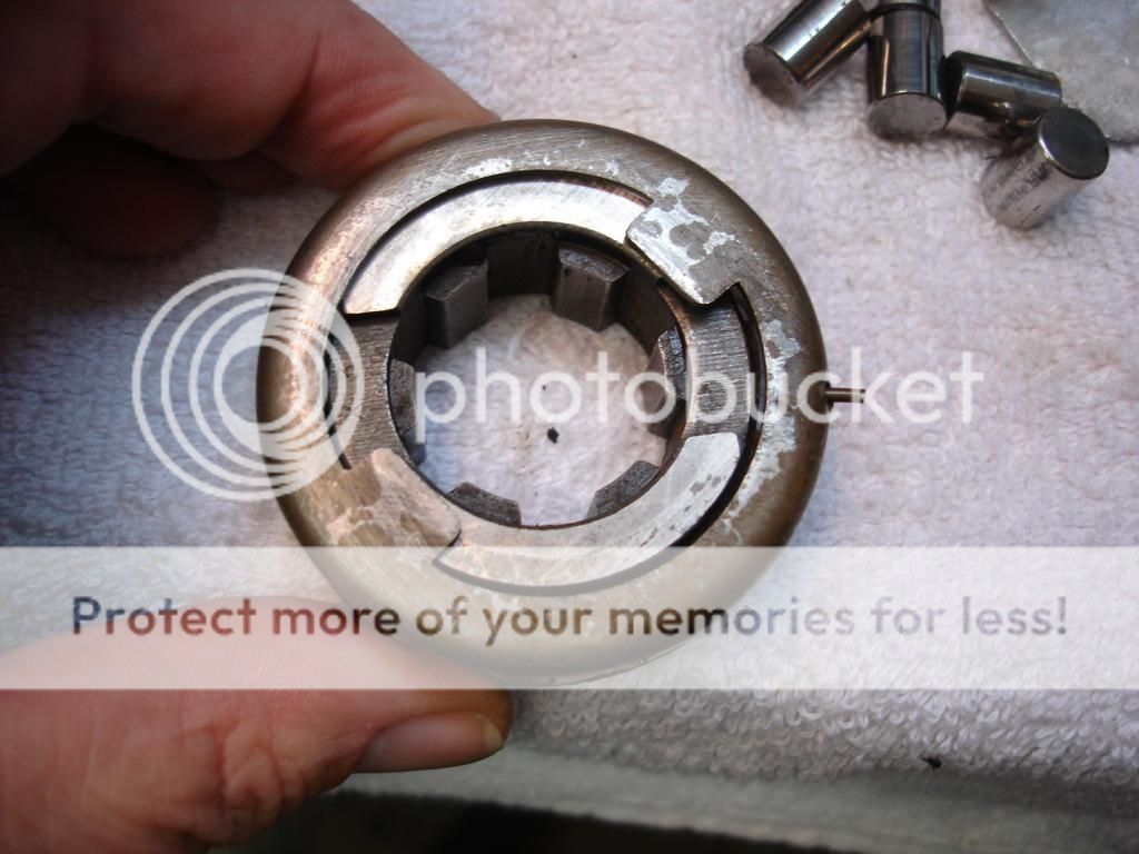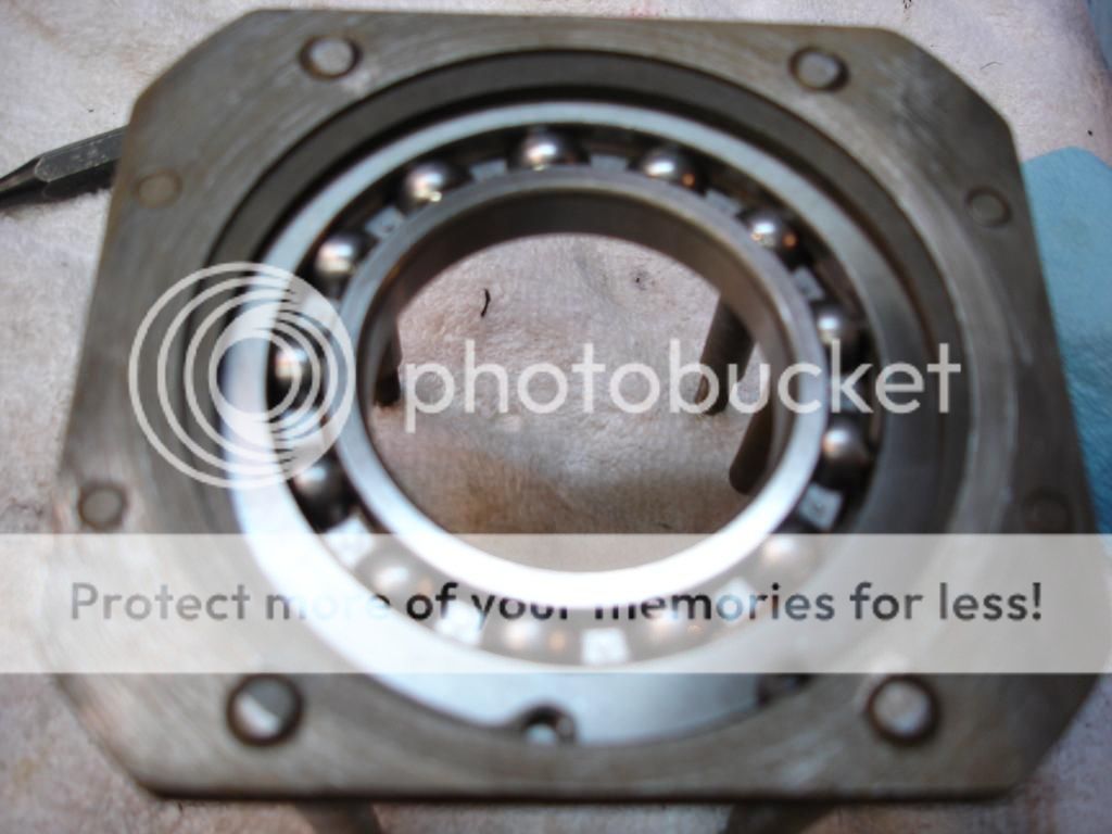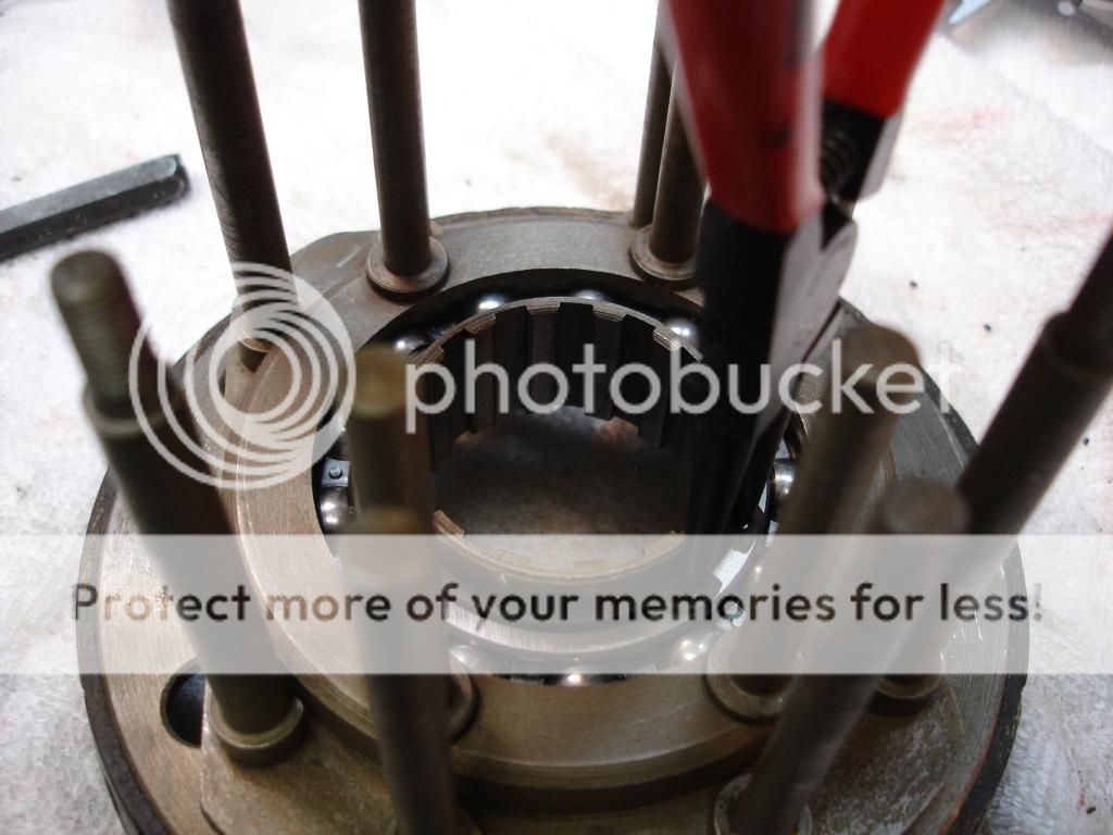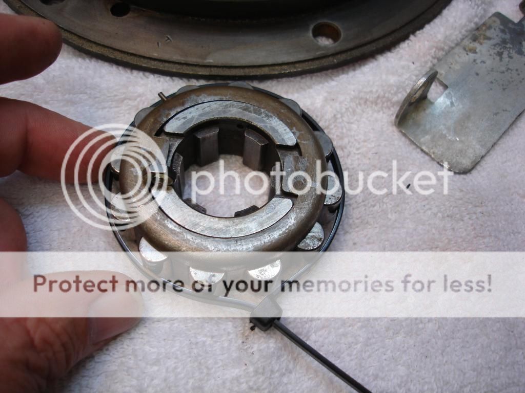 The clutch assembly goes together as follows. First, the large ball bearing is pressed into the cage. The fuzzy pic is to show the large snap ring that holds it in. This requires a heavy duty set of snap ring pliers to remove/install. I shattered 2 cheap pair removing it, so got an op to buy new tools!