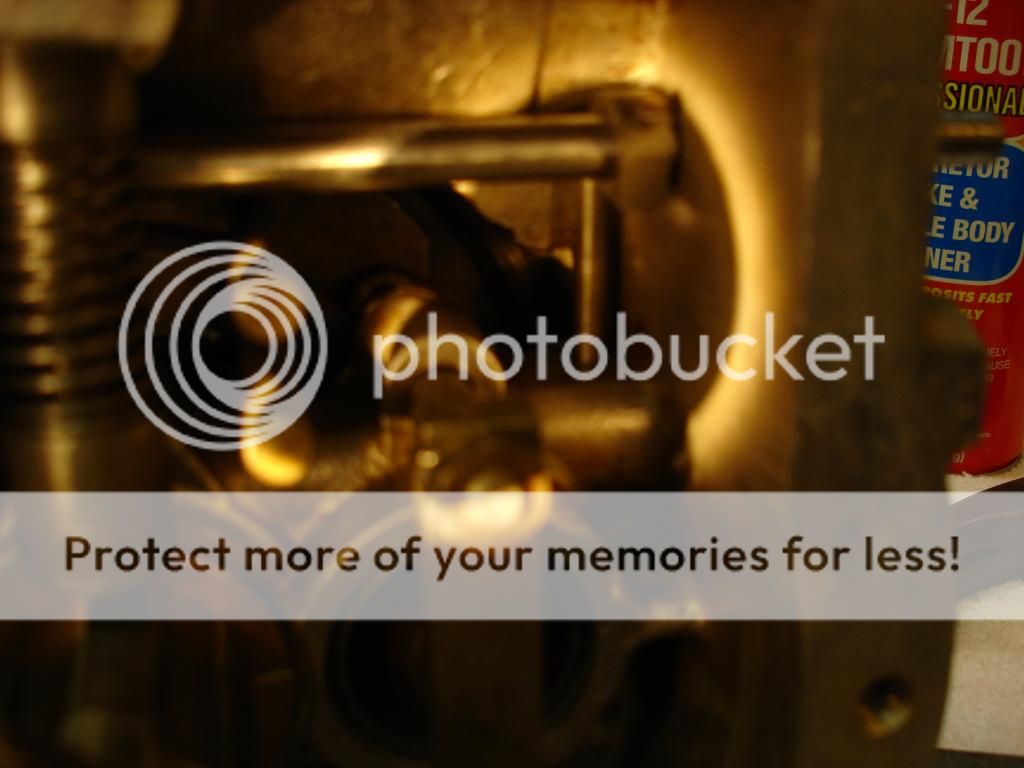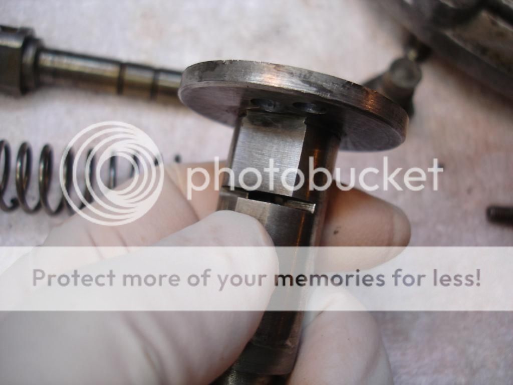 This is a terrible pic, but it shows a couple important parts. The actuator shaft goes through the OD unit at the bottom (which is towards the top of the pic). The solenoid turns the shaft on the left side of the OD, and inside the case there is a little cam block that lifts the end of the valve needle. If you can see, the cam is now in place and staked on the actuator shaft.