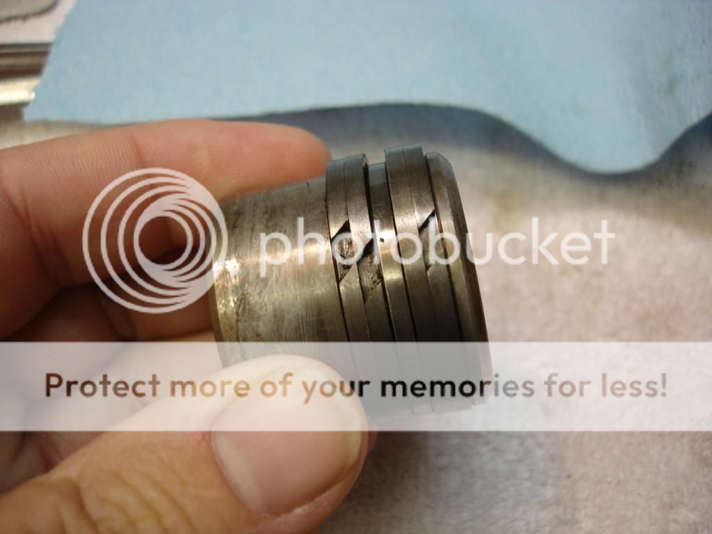 Next is the accumulator piston. This is the earlier, 1-1/8" accumulator. The new one has a housing that slips inside the casing. This early version just has the piston riding inside the aluminum casing bore. This pic shows the rings. They are very thin, like maybe .010" thick. There are actually 6 of them. 4 easily viewed from the outside, and 2 under those that push the outer rings even harder against the bore. In this pic the gaps are all lined up. I did this for cleaning only. During installation you want each ring gap spaced will away from the next ring gap.