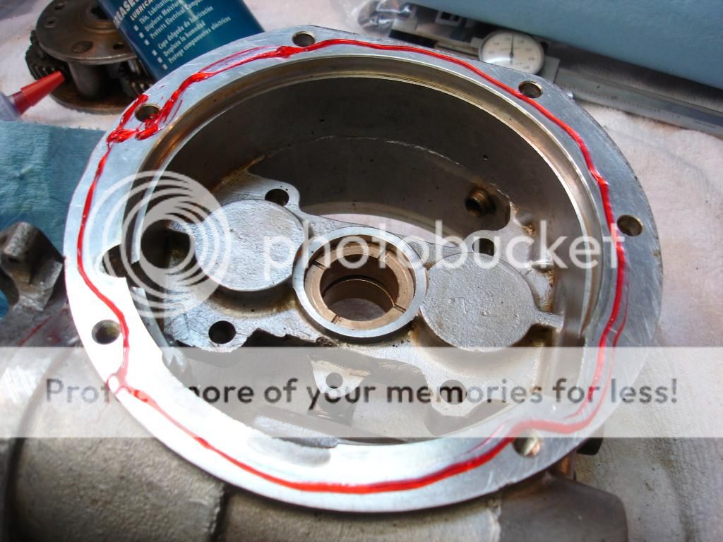 Finally, the "brake ring" goes in place. This is a big iron casting that press fits into both the case and the tail housing, like sandwich meat. The manual says "dry", but I cannot bring myself to fit any metal to metal assembly dry. I am using Loctite 518. It comes apart easily and will dissolve if any gets loose in the OD.