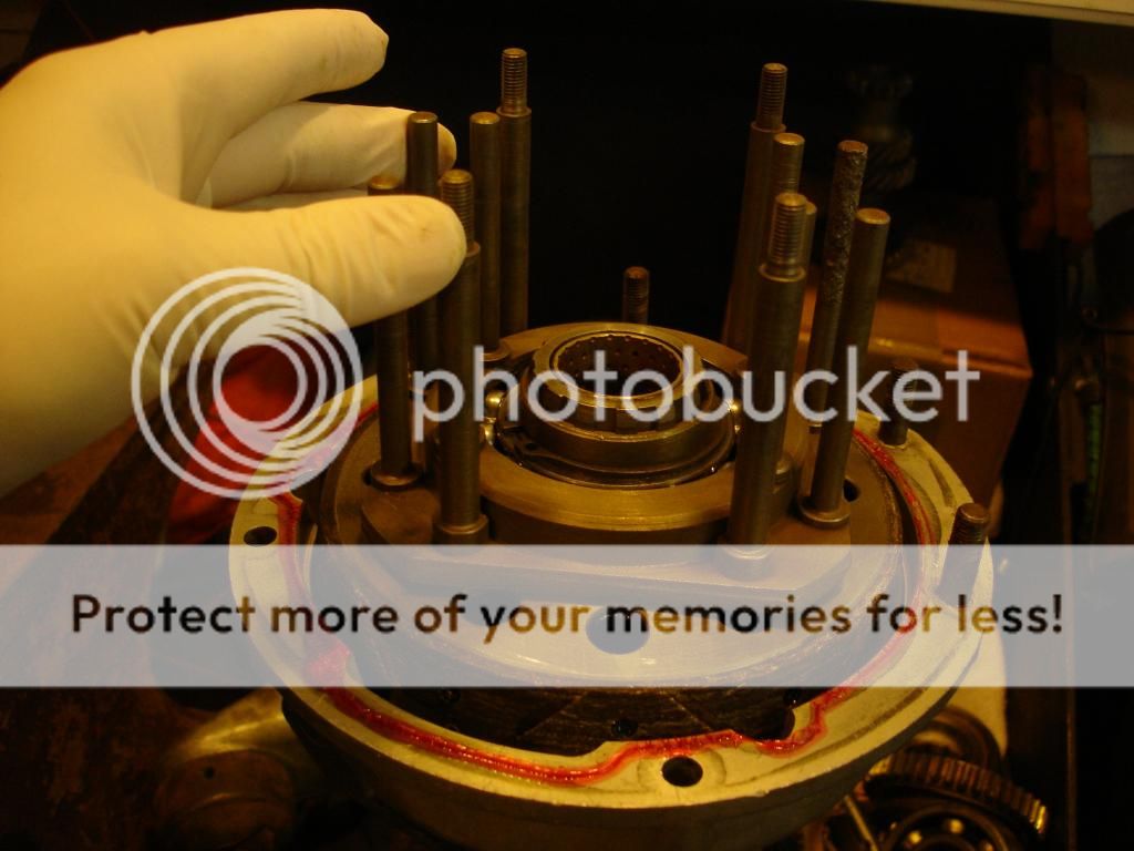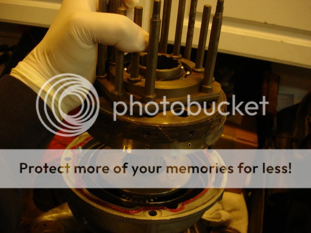 Now put the case back on. The studs with the threads stick through the main case forward, as shown. Now, we have to have a way to grab onto these studs and pull the clutch cage forward. These bars are what do that. They are just simple bars that go from stud to stud, and over the top of the actuator pistons we put in earlier. So, picture that when the pistons move out of their bore, they hit the bars, which are connected to the clutch cage. So, the cage moves forward, taking the clutch drum with it.
