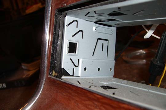 I’d bet anyone that has tackled this project has done something different. My head unit rotates down to expose a disk slot. I wanted to make sure that the door didn’t hit the lower lip of the console as it flipped open. The first photo shows how far back the radio cage is set behind the console face. I bent, then welded in some brackets that the cage would mount to. The welded portion encases the sides and bottom (second photo). The top bracket is screwed in. The bottom two blue arrows in photo #2 show drilled holes for the cage tangs to bend into, there are two more on the top bracket. The next photo shows the radio installed. Even with the cage set back behind the console, this radio still sticks out a smidge.