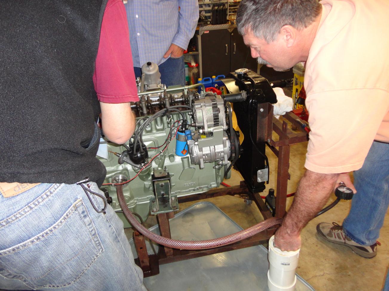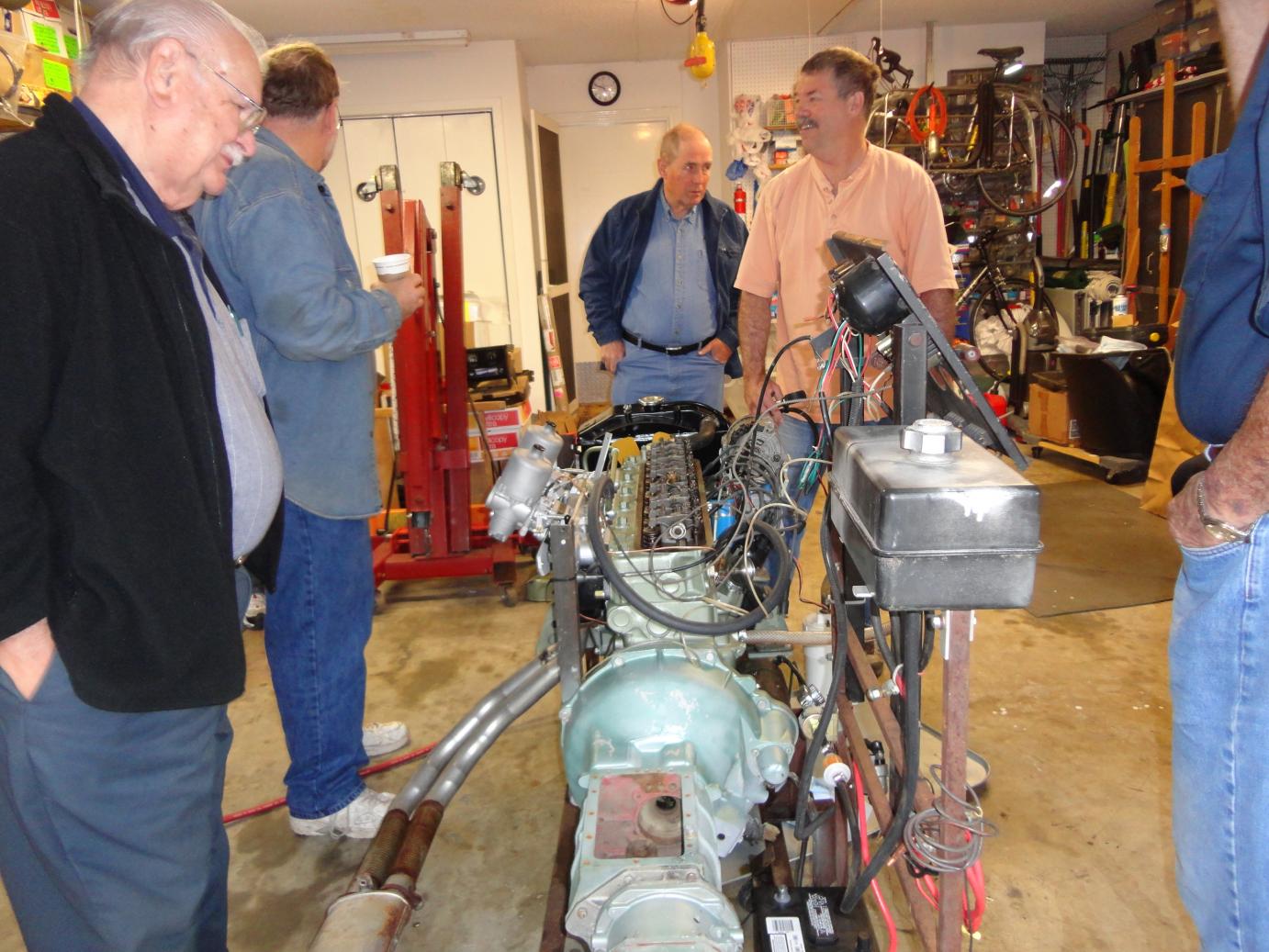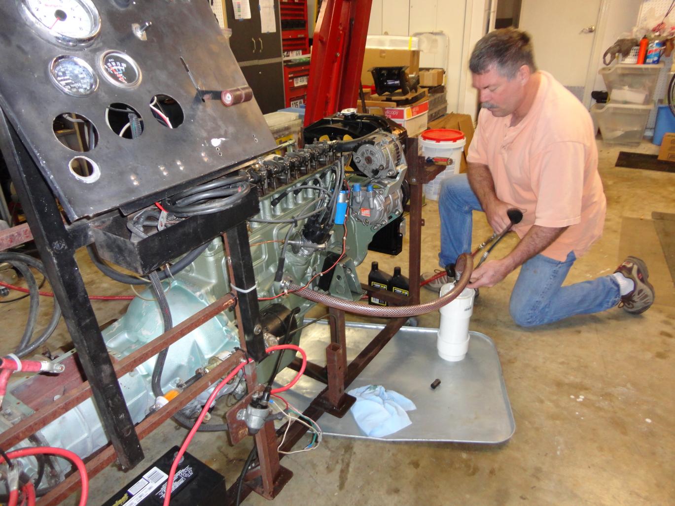 Here are pics of our clubs Engine Test Stand that our local club members can borrow to use to break-in their engine before it goes into the car. We have a dummy transmission to support the engine and exhaust pipes w/ mufflers. The engines owner must use their radiator, battery, etc. Also a pic of the "Engine Oil Primer" that a club member made to get oil through the engine before spinning and starting it up. It uses a home made oil tank and is hooked up to a small air-compressor and the engine is primed until oil is coming out of the rocker shaft and going down to the lifters. After starting the engine we run it up to a little over 2k rpm and adjust the timing, carbs, etc.