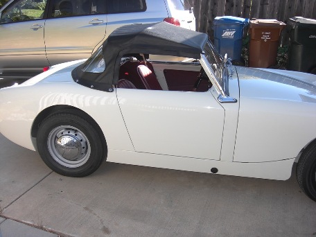 Welcome to the "I'm sure they made this top too small!" club. Heat, stretch, and take a break. Put the car and the top in the sun. Just a note to myself, do not wait until it is raining in November to put the top up again. Borrow a commercial heat gun. Collapse the bows down. Do you have the front and real steel pieces. I bought a leather punch set at Harbor Freight, very handy. Then go to town! I marked the center front and back with caulk. I first installed the back bar. Then went to the front and installed the two side snaps. Of course with a lot of pulling and strtching and adding heat. Take the top off and punch a hole, put it back on, make the next hole, more stretching, pulling, and more heat. 3 hours later, DONE!