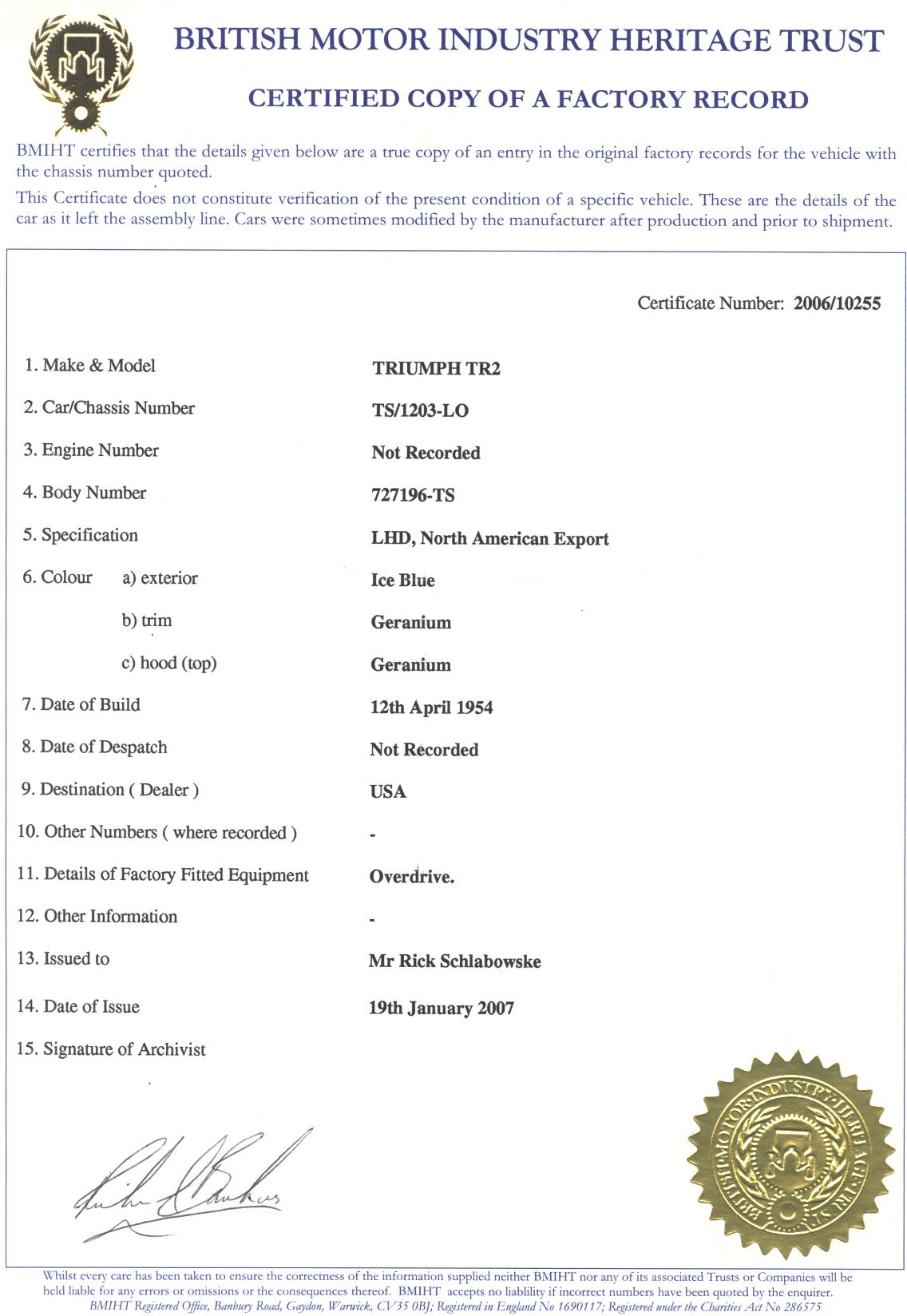 I see that the BMHIT Certificate costs 35 Pounds. There is an alternative to the Cert for TR2-3 owners. If you are a TRA member, you can get a build record for your car for $20 from Joel Rosen jrosenii@lycos.com .