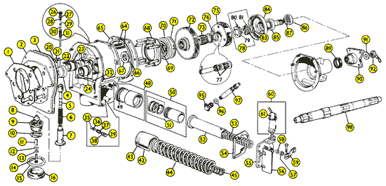 When the OD switch is activated, the Operating Valve is raised slightly, allowing pressure to escape through the hole in the side of the valve, and that pressure translates to the two operating pistons which push the thrust ring assembly to the rear, causing the sun gear to engage with the annulus and produce the increased rotations per RPM.