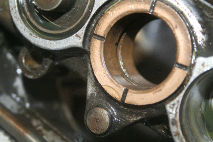 The bushing is supposedly not field-replaceable. New ones have to be bored concentric to the shaft, which requires either a special tool or a big milling machine. But that definitely is not enough damage on it to worry about. That face doesn't really take any force at all, just the pump cam wandering about a bit.