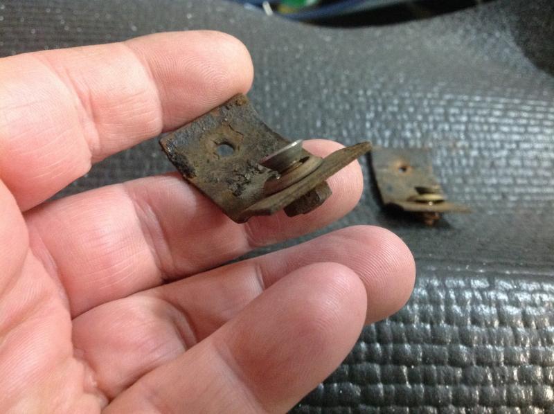 Sorry for the poor resolution. In this pic you can see the fuel tank strap bolt, and just inboard from that is a tab that extends down from the backboard and is held with a small sheet metal screw. I believe the tab is riveted to the backboard, so it sounds like you are looking at the rivet on yours, and the tab is missing. The tab is just a thin piece of metal that is bent about 30 degrees to match the floorboard. There are two tabs.