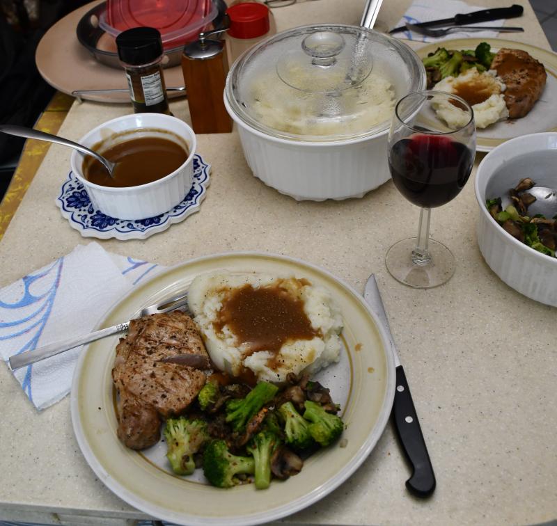 We're hunker'd down here, just us two. No bird this year, doin' porkchops on the charcoal, smashed spuds with pre-packaged pork gravy,, steamed fresh veggies & some dago red wine. Will try a slice of the pie with vanilla ice cream for dessert, then go torpid on th' couch. :wink: