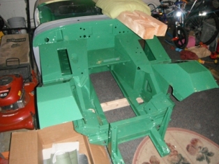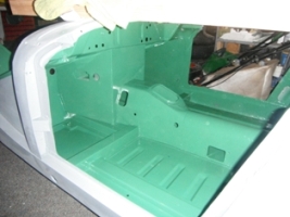 .....Just kidding. I'm working on the bonnet structure now, but here's some photo's of the paint I put on in September. It's single stage urethane from TCP Global. I ordered the paint from them because they had the original paint chip of this color and I wanted to see how it looked. The paint itself went down well so I decided to go ahead and paint the bottom, engine compartment and interior. That way I was able to get the tub down off the rotisserie and be done with it. I've read nothing but positive reviews about this company, and it's paint, so I felt confident that the paint would be good enough for these areas. I'll probably still use PPG for the outside of the car just because it's such a proven product. But if anyone was looking for a report on TCP Global paint I'll give 'em a thumbs up.