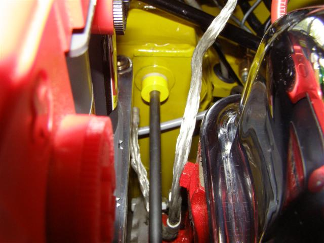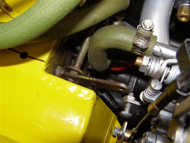 Would anyone have a picture handy of where the throttle linkage spring goes? It is the long spring on the horizontal and adjustable rod going from the bulkhead to the carbs. Does the spring go inbetween the bulkhead and bracket, or, between the bracket and carbs?