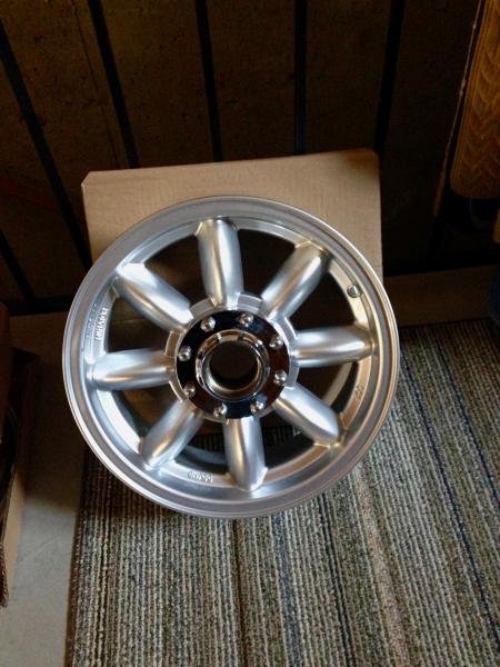 I installed splined alloys purchased from Rimmer Bros in the UK at competitive prices. These replaced my 60 spoke painted wires that were sold to Tush. Very good quality and good performance with Vredetstein 165SR15's mounted. They really fill the wheel opening nicely.