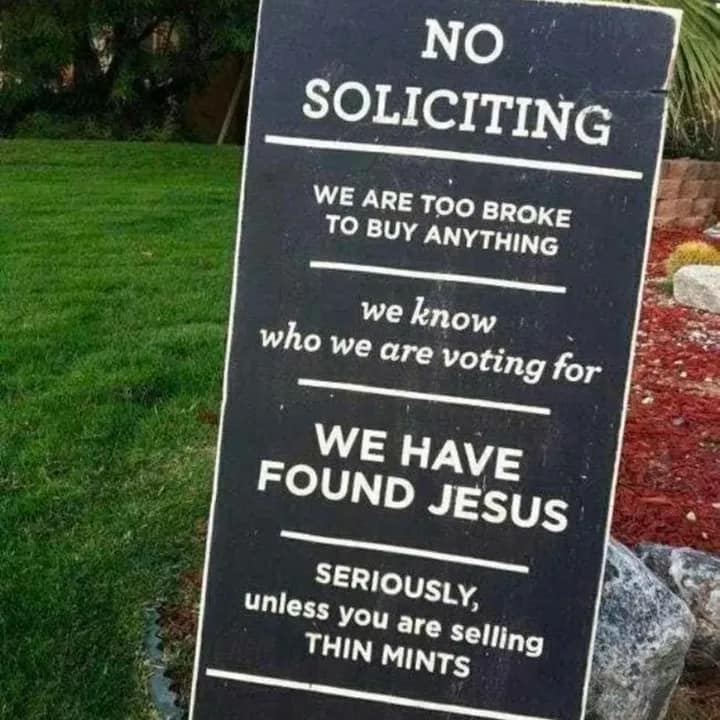 I have a similar sign in my garage. The last line is more general - unless you're selling girl scout cookies. My better half wouldn't let me hang it by the front door.Let's get serious...